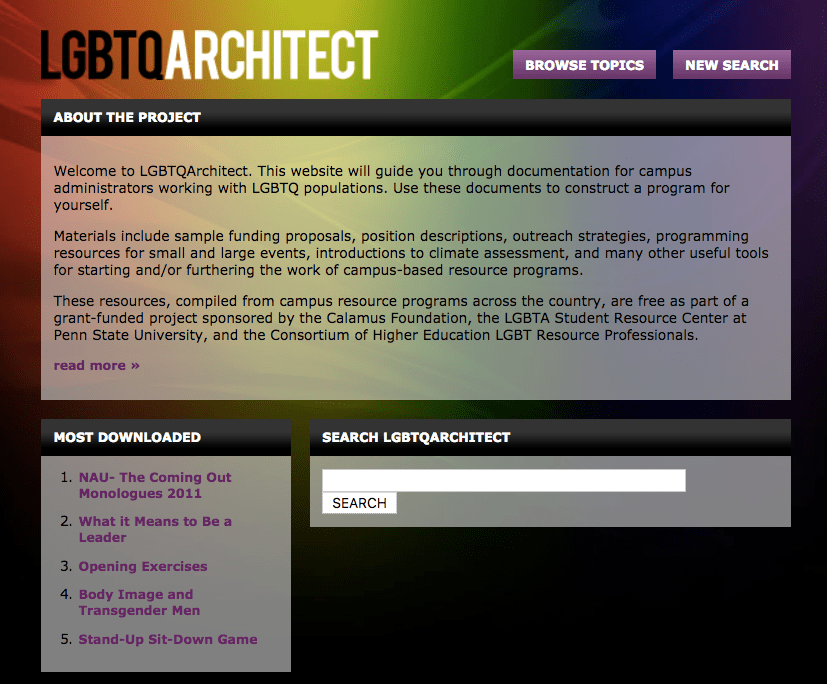 The most comprehensive resource I return to time and time again is the Consortium of Higher Education LGBT Resource Professionals (I call them “the Consortium” to save some life force). I can’t rave enough about the powerful model of collective information and knowledge sharing between practitioners. If you are not a member yet, I strongly suggest you become one. They don’t turn anyone away for lack of funds, so they can make it accessible for all.